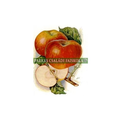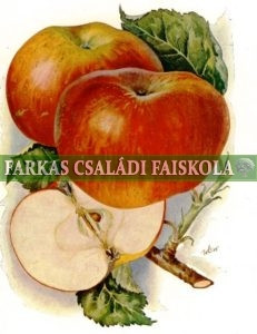 Október végi érésű lapos alma. Kárminpiros csíkos.